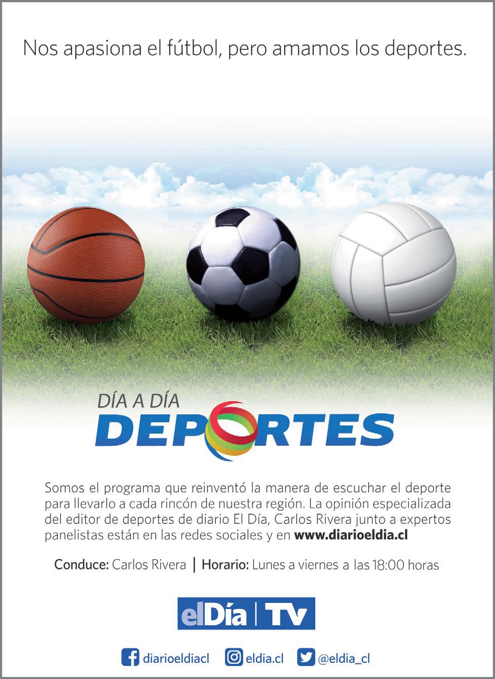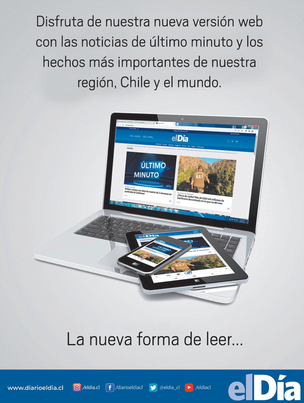 SERVICIOS I LUNES 3 DE OCTUBRE DE 2022 I el Día22 I AVISOs DE DEFUNCIÓN, agradecimientos y condolencias PUBLIQUE SUS CONTACTO: PEDRO JAIME DÍAZ E-mail: pjaime@eldia.la Teléfono/WhatsApp: +569 84186590 El Tiempo ELQUI LIMARÍ CHOAPA TEMPERATURAS MÍNIMA Y MÁXIMA Illapel HOY MARTES MIÉRCOLES 9-30 19-31 18-29 Radiación 11+ Los Vilos HOY MARTES MIÉRCOLES 14-22 17-22 14-20 Radiación 11+ HOY MARTES MIÉRCOLES 14-26 15-22 13-22 Radiación 11+ CanelaRío Hurtado HOY MARTES MIÉRCOLES 9/23 10/23 8/20 Radiación 11+ Monte Patria HOY MARTES MIÉRCOLES 6/24 7/22 15/23 Radiación 11+ Ovalle HOY MARTES MIÉRCOLES 6.22 6-/21 8-23 Radiación 11+ Vicuña HOY MARTES MIÉRCOLES 9 /13 4 /15 9 /16 Radiación 11+ Coquimbo HOY MARTES MIÉRCOLES 13 /14 11 /15 10 /13 Radiación 11+ La Serena HOY MARTES MIÉRCOLES 12 /14 9 /15 9 /14 Radiación 11+ 02 Chilevisión 04 TVN 05 UCV TV 07 La Red 11 Mega 13 Canal 13 TV Abierta 06.30 Contigo CHV Noticias A.M. 08.00 Contigo en la mañana. 13.00 CHV Noticias tarde 15.30 Contigo en directo 17.55 Gracias Virgen de Andacollo Por favor concedido