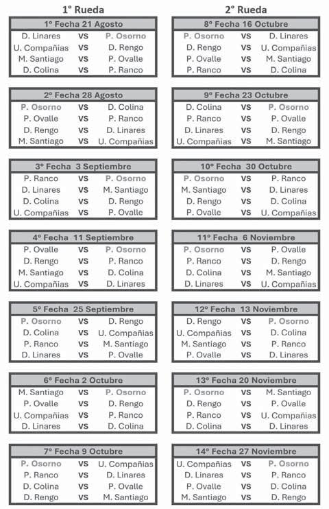 EL DUC El camino de Deportes Unión Compañías en el zonal norte fue más tortuoso. Clasificó en la cuarta ubicación y en el último minuto de ese polémico duelo con Municipal Salamanca, dejando atrás lo que había significado el cambio en la banca técnica. Las expectativas de los celestes son altas, considerando que se armaron para pelear el ascenso. El equipo que hoy dirige Ramón Climent, será local este fin de semana en La Portada recibiendo a Deportes Rengo y en la segunda fecha viajará hasta la capital para enfrentar a Municipal Santiago. En la fecha 3 tendrá el clásico regional con Provincial Ovalle, en calidad de local, manteniendo esa condición en la cuarta fecha recibiendo a Linares. Serán visitantes en la quinta jornada ante Colina, mientras que en la sexta recibirán a Ranco, cerrando la primera vuelta de forastero ante Provincial Osorno.