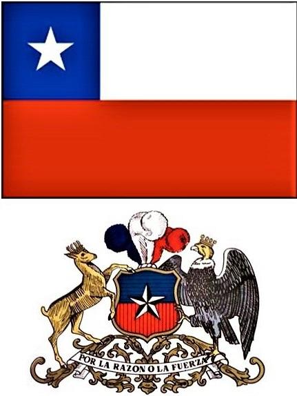 El escudo tiene los mismos colores de la bandera nacional. Dos campos en partes iguales: en el campo cortado de azul y de gales, una estrella de plata; tendrá por timbre un plumaje tricolor turquí, blanco y encarnado y por soporte un huemul a la izquierda y un cóndor a la derecha, coronado cada uno de estos animales con una corona naval de oro -simbolizan nuestras glorias navales-, y el penacho, símbolo que usaban en el sombrero los presidentes de la República. Abajo, el lema “Por la razón o la fuerza”