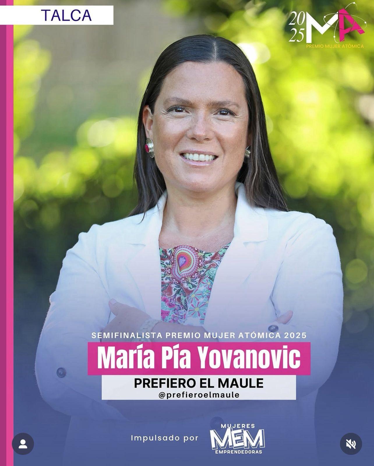 La líder regional y fundadora de Prefiero el Maule, María Pía Yovanovic, fue seleccionada como una de las 10 semifinalistas del Premio “Mujer Atómica 2025”, entre más de 600 emprendedoras de todo Chile que postularon a esta segunda versión del galardón. Este reconocimiento destaca a mujeres que están generando transformaciones reales en sus territorios a través de su liderazgo, impacto social y contribución al emprendimiento. Como semifinalista, María Pía deberá presentar un pitch presen-