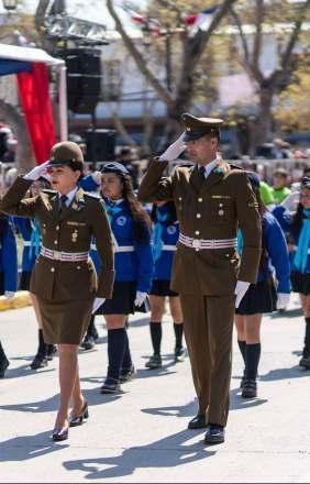 Carabineros de Integración Comunitaria de la 24ª Comisaría, par cipan en desfile de fiestas patrias junto a brigada escolar de Escuela Santa Rosa de Esmeralda.