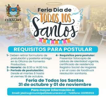 La Municipalidad de Curacaví ha anunciado la apertura de postulaciones para la Feria del Día de Todos los Santos, que se llevará a cabo a las afueras del Cementerio Municipal, calle José Guillermo Salas Las postulaciones estarán disponibles hasta el viernes 18deoctubre.