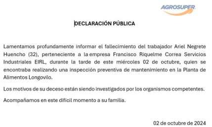 Delhechoseinformóalfiscaldeturnoparainiciarlarespectivainvestigacióndeestetrágico accidente laboral En tanto, desde la empresa Agrosuper mediante un comunicado lamentaron el hecho y señalaron que “los motivos de su deceso están siendo investigados por difíciles momentos.