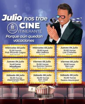 es el cine, además que habrá sorpresas para todos los integrantes de la familia, como son las populares cabritas para acompañar la película, así que solo invitarlos para que puedan pasar un rato agradable junto a sus amigos, padres y familia”. Asimismo, la Directora de Desarrollo Comunitario, Nicole Soto, manifestó que, “Julio nos trae cine a todos los niños de la comuna, y hoy miércoles 3 estaremos en la población Ricardo Lagos, y en sector Poniente de Alto de Llollinco, en la sede vecinal y en la escuela respectivamente, mañana jueves 4 de julio a las 15:00