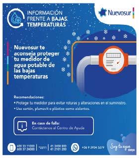 cada usuario proteja adecuadamente su medidor de agua y de ocurrir una falla, producto de las bajas temperaturas, “los clientes deben avisar al Centro de Ayuda de Nuevosur para que nuestros equipos acudan hasta su hogar para restablecer el servicio a través de una solución provisoria a la espera de la instala -