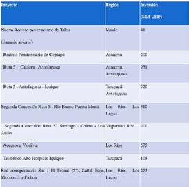 Entre los llamados a licitación destaca a proyectos Sistema de Alerta de Tsunami, Ruta 5 tramos Iquique-Antofagasta y Caldera-Antofagasta, así como la red de electrocorredores de Concepción en rutas 150 y 160, el teleférico de Alto HospicioIquique, la desaladora de Coquimbo y los recintos penitenciarios de Talca y Copiapó.
