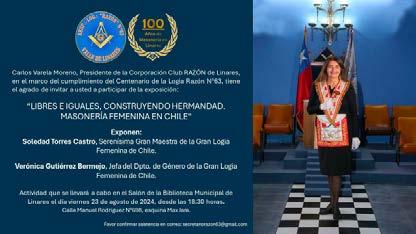 de sus gestión y contarles a la comunidad linarense quienes son y a que se dedican como institución. Al respecto, el representante de la institución en la ciudad de Linares, Carlos Varela, señaló que, “Este viernes 23 de agosto tenemos la visita de la Gran Maestra de la Logia femenina de Chile, vendrá a exponer sobre masonería femenina en el país, así que invitamos a toda la comunidad que quiere sumarse a esta interesante actividad, y para nosotros como Logia Razón 63 es importante realizar este tipo de eventos para la comunidad porque nos permite hablar de masonería y lo que ha hecho nuestro Logia Razón 63 en sus 100 años de existencia aquí en la comuna, y en el mes de octubre estamos de aniversario y queremos ser partícipe a la comunidad de Linares todo lo que ha sido la conmemoración de estos 100 años de existencia”.