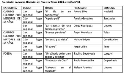 Fueron 9 los ganadores regionales en las tres categorías clásicas: Poesías del mundo rural, Cuentos escritos por menores de 14 años y Cuentos escritos por mayores de 14 años. Los ganadores son 4 de la provincia de Linares (Longaví, Linares y San Javier), 3 de la provincia de Talca (Empedrado, Talca y Constitución) y dos de la provincia de Curicó (Teno y Hualañé).