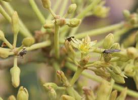 Además, el estudio determinó que la tasa de visita por minuto fue superior en abejas melíferas y moscas, siendo estas últimas particularmente relevantes, ya que su abundancia mostró una correlación positiva significativa con la producción de frutos por panícula. Curiosamente, la abundancia de abejas melíferas no se relacionó con el rendimiento, lo que sugiere que una mayor diversidad de polinizadores silvestres complementa y mejora la eficacia polinizadora del agroecosistema.