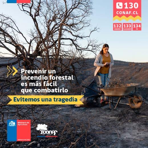 “Con esta campaña buscamos una participación activa de la comunidad en temas de prevención de incendios con una perspectiva de corresponsabilidad, asumiendo responsabilidades todas y todos. Acciones simples, como llamar oportunamente al 130 de CONAF, recoger basura, evitar uso de herramientas que generen chispas en días de altas temperaturas, pueden evitar una tragedia. El trabajo colaborativo en prevención persigue el cuidado de las personas, infraestructura, ecosistemas y los múltiples servicios que proveen para la sociedad”, acotó el director ejecutivo de CONAF, Christian Little.
