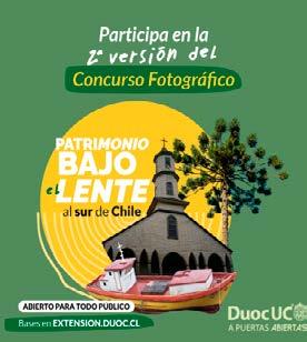 Durante el Mes del Patrimonio, Duoc UC a través de su Área de Extensión, invita a participar de la segunda versión de su concurso de fotografía “Patrimonio Bajo el Lente”, esta vez enfocado en el sur de nuestro país. Esta iniciativa, busca rescatar y retratar el patrimonio natural, arquitectónico y popular de nuestro país, a través de la fotografía.