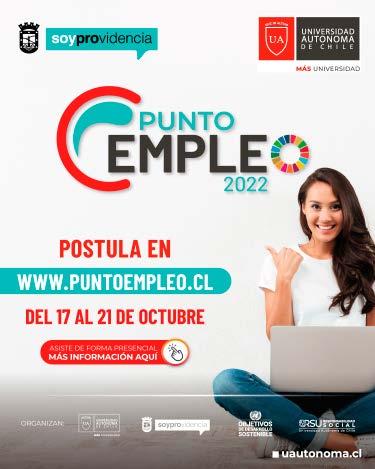 Con el objetivo de impul sar la reactivación laboral y la recuperación de los puestos de trabajo, la Mu nicipalidad de Providencia y la Universidad Autóno ma de Chile organizan la sexta edición de la Feria Punto Empleo 2022, acti vidad gratuita en la que se ofrecerán cerca de 5.000 vacantes a todo público, con énfasis en personas en situación de discapacidad, adultos mayores y mujeres, tanto de residentes en Pro videncia como de otras co munas de la Región Metro politana. Además, este año se extenderá a regiones, por lo que también podrán postular personas que no residan en Santiago.