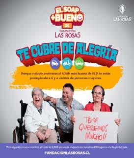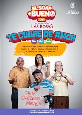 sente a las personas mayores que entregaron su vida y su esfuerzo para construir la sociedad en la que hoy vivimos. Ahora ellos necesitan de nosotros”, remarca la directora. El trámite para contratar el SOAP 2023 es 100% online y se realiza a través del sitio web de la institución www.fundacionlasrosas. cl. Quienes quieran ayudar contratando el “Seguro + Bueno”, lo pueden hacer desde su computador o teléfono móvil y recibirán el documento final del seguro en su correo electrónico. Para recibir orientación y consultas, es posible llamar al Contact Center de Fundación Las Rosas: 800.720.111.