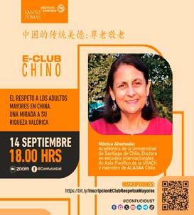 book del IC ST o preinscribirse en el enlace https://bit.ly/InscripcionEClubRespetoaMayores para conectarse por ZOOM. La encargada de presentar este Webinar será Mónica Ahumada, académica de la Universidad de Santiago de Chile, doctora en estudios internacionales de AsiaPacífico de la USACH y miembro de ALADAA Chile. En esta sesión la expositora abordará los principios confucianos y el respeto, más allá de un concepto de jerarquía; la familia china tradicional y sus ancestros: el padre y la madre; la ley de protección de los derechos y los intereses de los adultos mayores; la sociedad actual china y sus adultos mayores; entre otros.