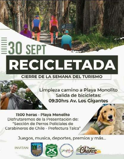experiencia entretenida acompañada del deporte y la limpieza del camino a la playa “Monolito”; lo que consistirá en salir desde este lugar, el Sábado 30 a las 09:30 hrs (Avenida “Los Gigantes”) en bicicleta, e ir realizando un recorrido limpiando el sector; para posteriomente, a las 11:00 hrs reunierse en la Playa Monolito y, disfrutar de un espacio entretenido y didáctico con la presentación de la “Sección de Perros policiales de Carabineros de Chile- Prefectura de Talca”.