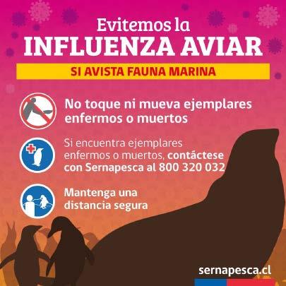 “Esto es parte de un problema mundial. Tanto en Estados Unidos como en Perú ya se habían registrado lobos marinos afectados por influenza aviar. También tenemos un caso de pingüino afectado por esta gripe en Antofagasta, así que hacemos un llamado a la ciudadanía a no manipular animales marinos varados vivos o muertos, no alimentar y mantener distancia e informar inmediatamente a Sernapesca a través de la línea 800 320 032”, señaló Soledad Tapia. Desde el inicio de la Emergencia por IAAP en Chile se ha detectado el virus en 21 especies de aves silvestres acuáticas, siendo el pelícano la más afectada.