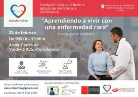 La fundación Vasculitis Chile, en vísperas de la conmemoración del Día Internacional de las Enfermedades Raras (28 de febrero), realizará el encuentro “Aprendiendo a vivir con una enfermedad rara” el cual congregará a personas que padecen enfermedades raras este sábado, entre las 09:00 y las 13:00 horas, en el audito -