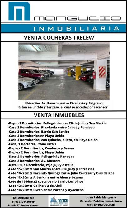 Se alquila cochera. Ubicada en 25 de mayo. Trelew. Cel. 2804590801. (0304)