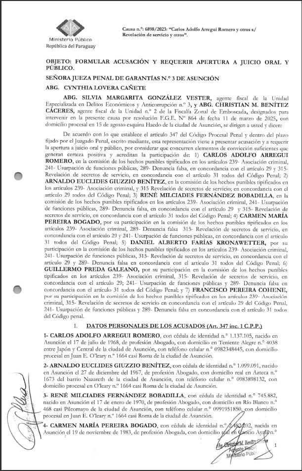 Los fiscales Silvia González y Christian Benítez presentaron acusación contra Carlos Arregui, Arnaldo Giuzzio, René Fernández, Carmen Pereira, Daniel Alberto Farías, Guillermo Preda Galeano y Francisco Pereira Cohene por los hechos punibles de asociación criminal, usurpación de funciones públicas, denuncia falsa, y revelación de secretos de servicio.