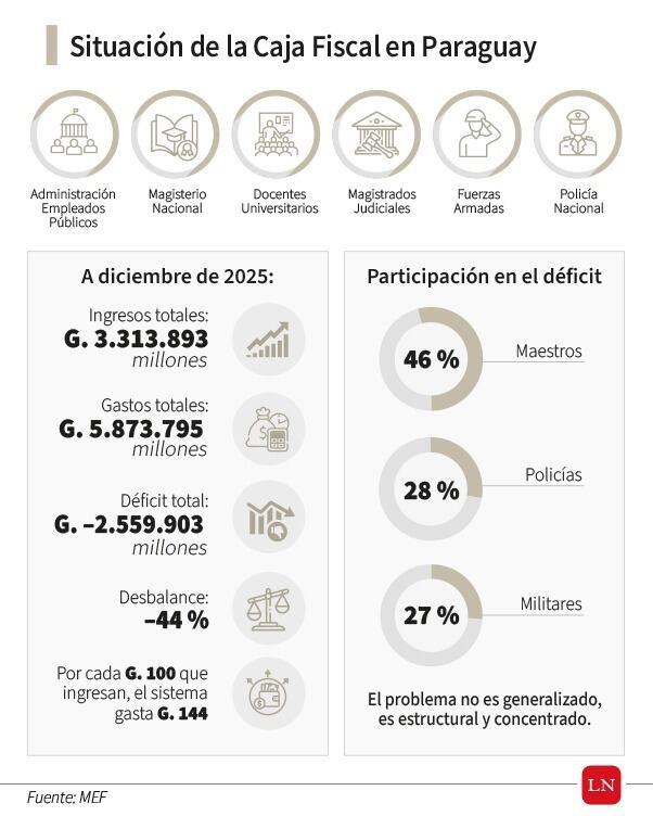 Los números muestran que el déficit no es generalizado, sino concentrado en sectores específicos. En 2025, la Caja Fiscal registró ingresos por G. 3,31 billones y gastos por G. 5,87 billones, con un déficit total de G. 2,56 billones (USD 380 millones), equivalente a un desbalance del 44 %.