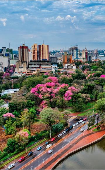 de cemento convive con la delicadeza de las flores de lapacho