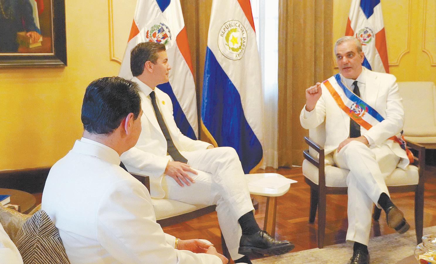 El presidente Santiago Peña tras asistir a la ceremonia de juramento de Luis Abinader, quien asumió su segundo mandato como presidente de República Dominicana, mantuvo una reunión bilateral, en que también participó el canciller Rubén Ramírez Lezcano.