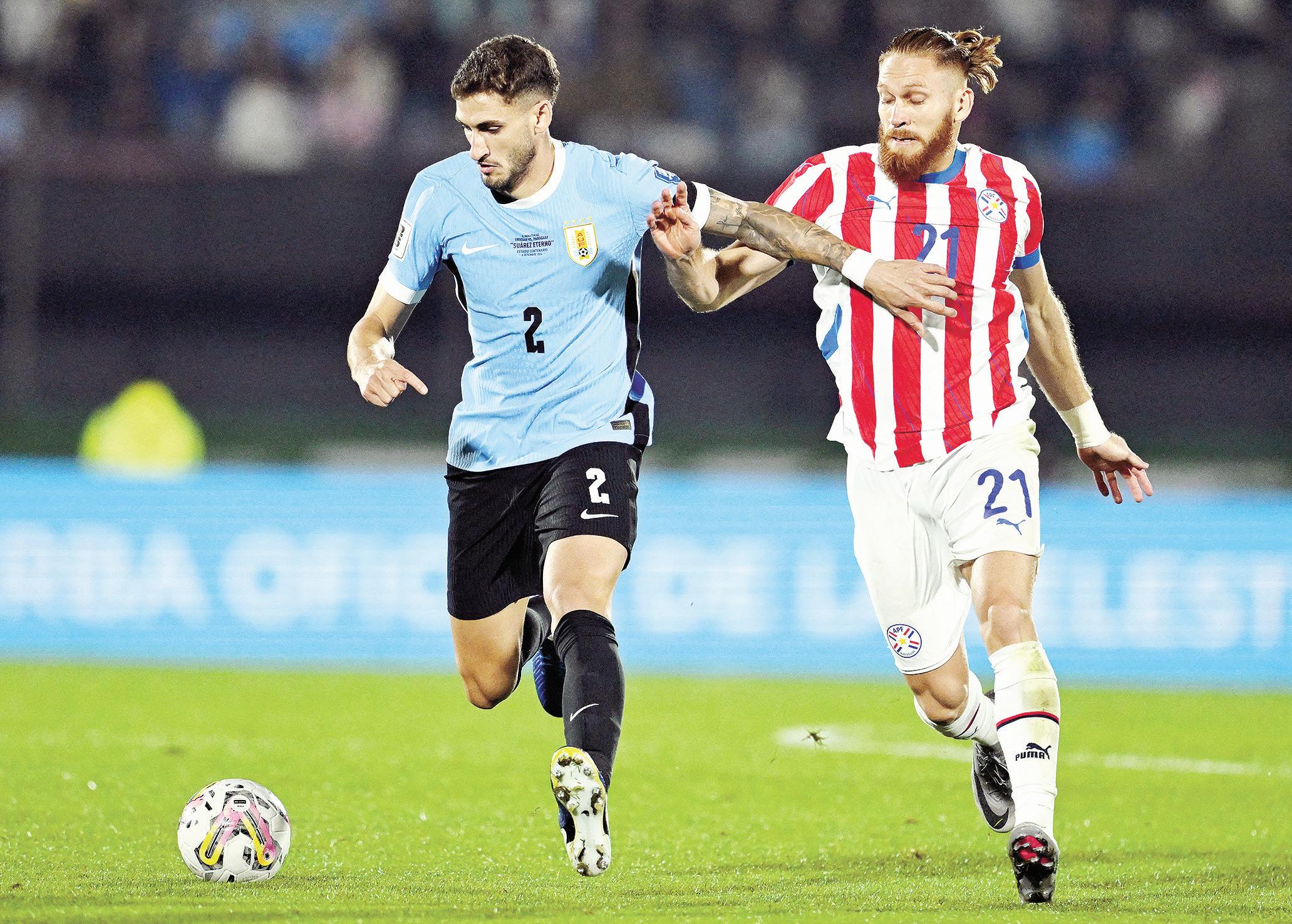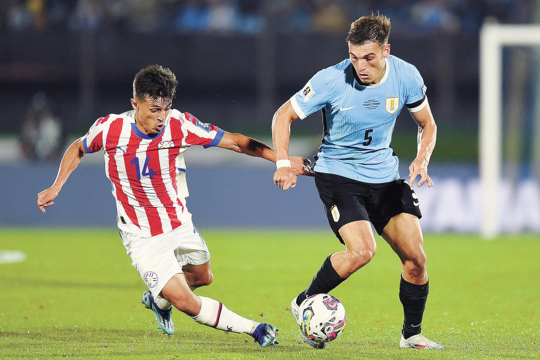El volante guaraní Andrés Cubas disputa el balón ante Manuel Ugarte de Uruguay