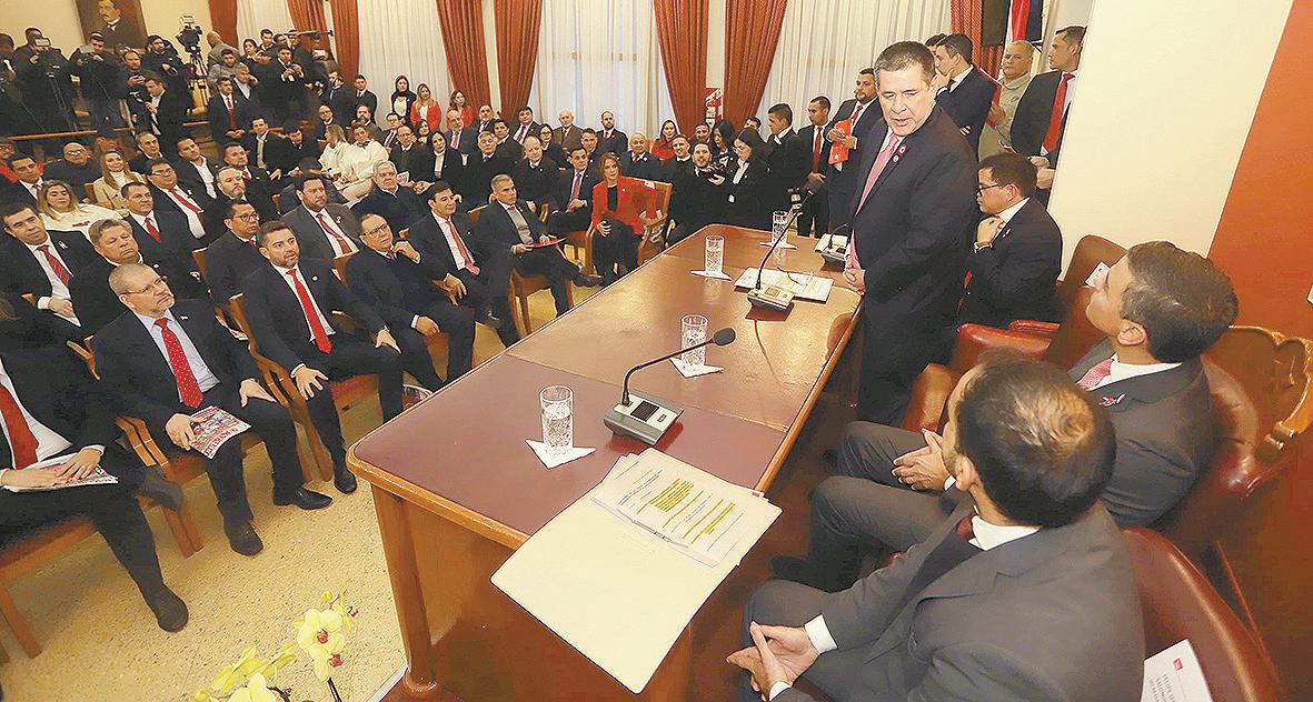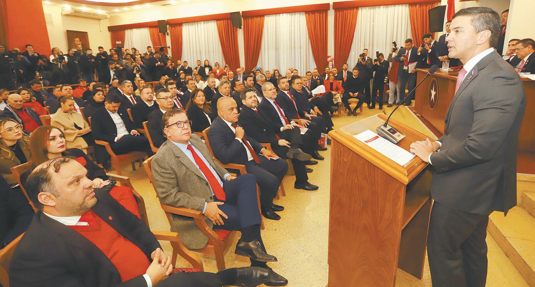 El mandatario asistió a la sede colorada para brindar ante los dirigentes de su partido detalles del avance de su gestión al frente del Poder Ejecutivo, a poco más de nueve meses del inicio del periodo constitucional.