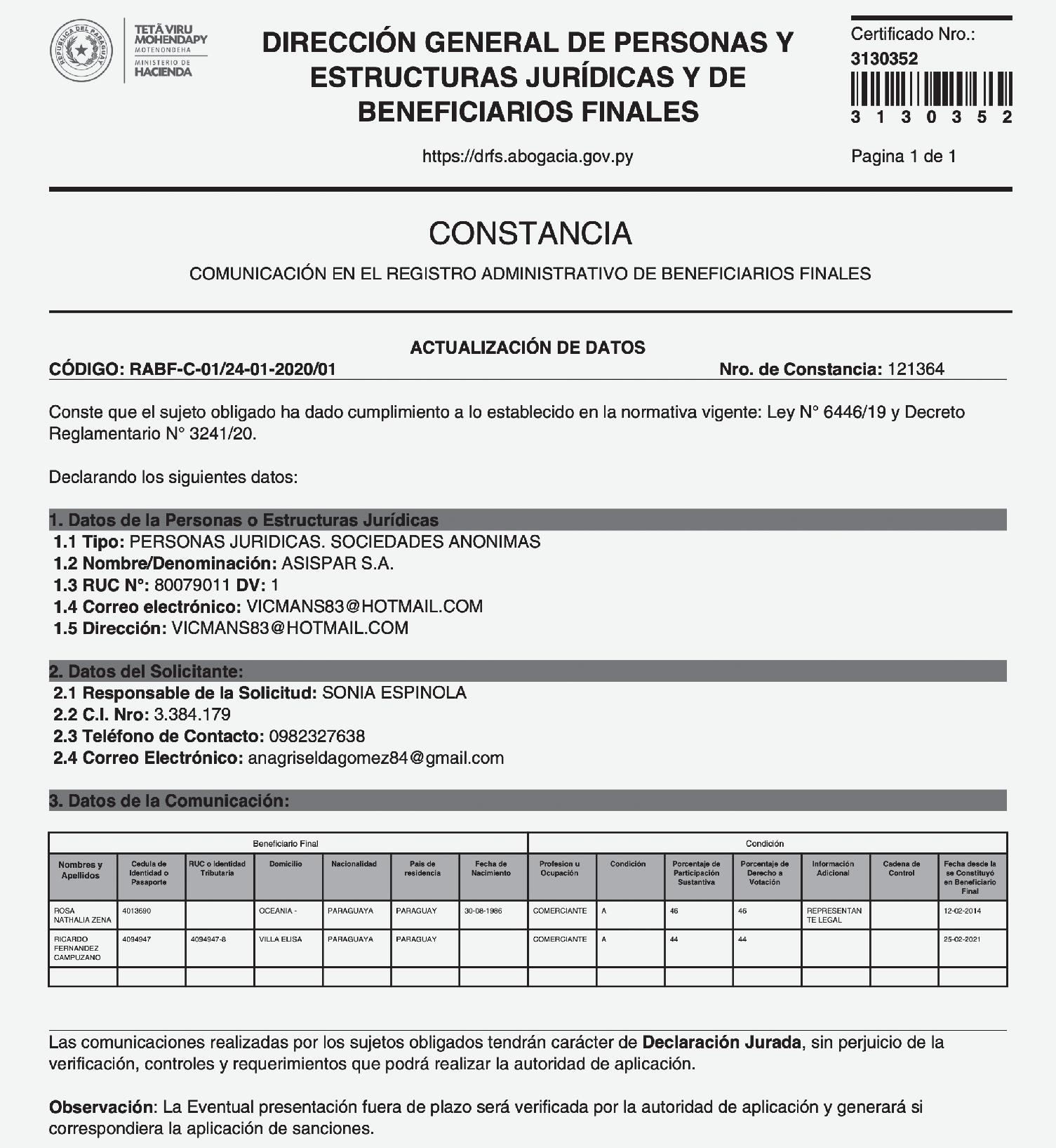 En Asispar SA también aparece Rosa Nathalia Zena con el 46 % de las