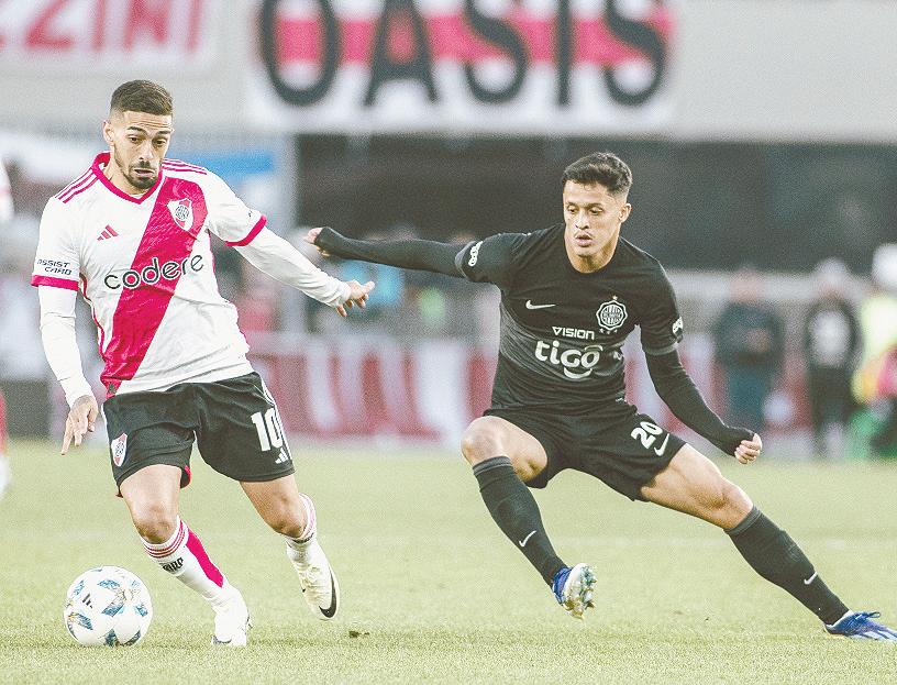 Alex Franco ante Manuel Lanzini. El volante franjeado no tuvo un buen desempeño en la derrota de Olimpia ante River