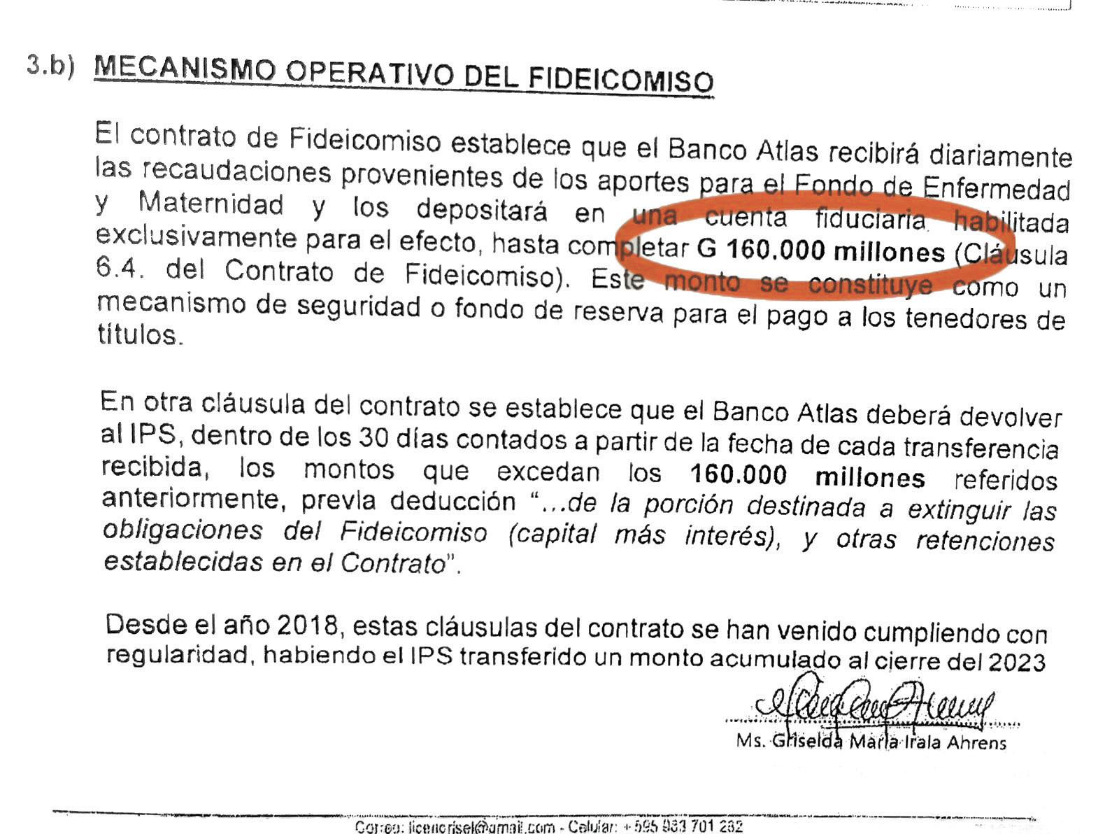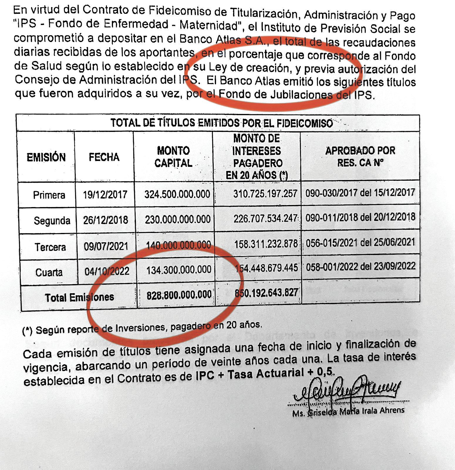de Titularización, Administración y Pago IPS - Fondo de Enfermedad y Maternidad con el banco Atlas. Tras obtener el visto bueno de la Superintendencia de Bancos, el IPS firmó el contrato en diciembre de 2017 con la entidad bancaria de los Zuccolillo y la adenda final se hizo en diciembre de 2018.