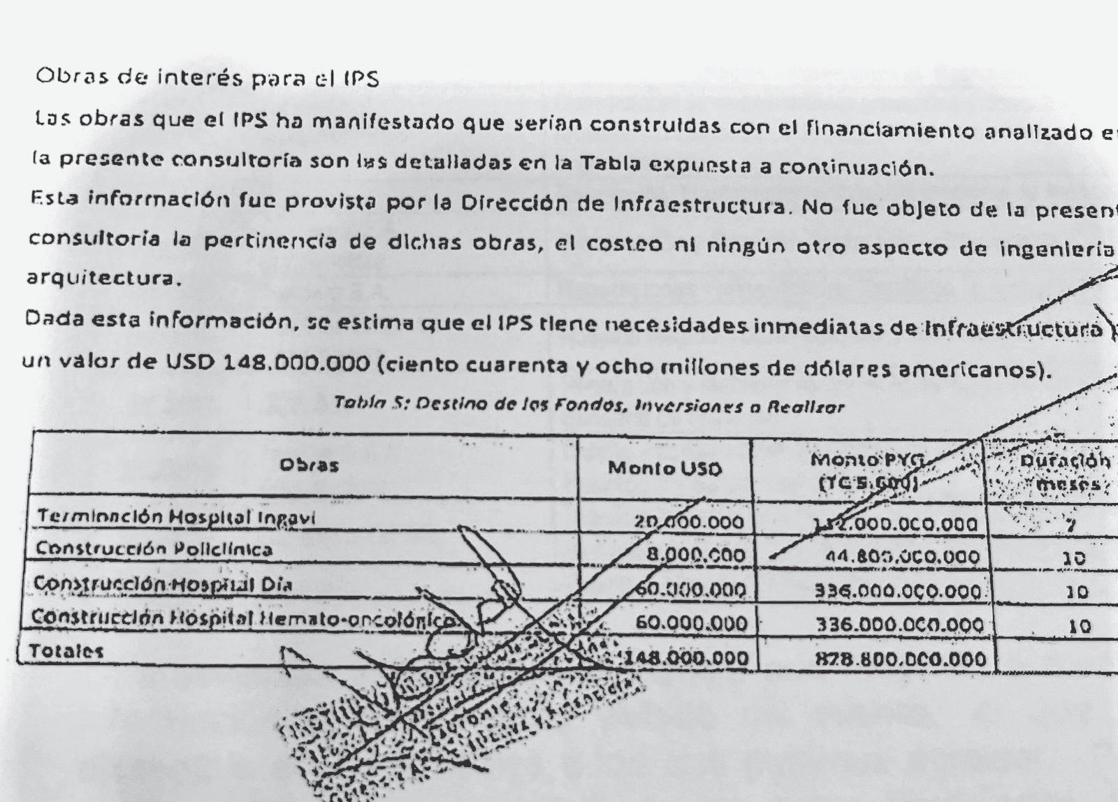 Un informe de consultoría realizado por la actual administración del Instituto de Previsión Social (IPS) desnuda un escandaloso hecho de corrupción que salpica al banco Atlas (Grupo Zuccolillo) y a las anteriores autoridades de la previsional. El contrato de fideicomiso suscrito por las dos instituciones, por valor de G. 828 mil millones, especifica la construcción de cuatro obras, sin embargo, las obras no están y la plata se esfumó. Es decir, calzaron el presupuesto de salud del IPS con dichos montos, hasta salarios se han pagado con esos recursos y ahora el banco de los Zuccolillo retiene cada mes del IPS G. 160 mil millones para saldar la deuda generada. El banco es corresponsable por permitir que el dinero se haya destinado a otro fin.