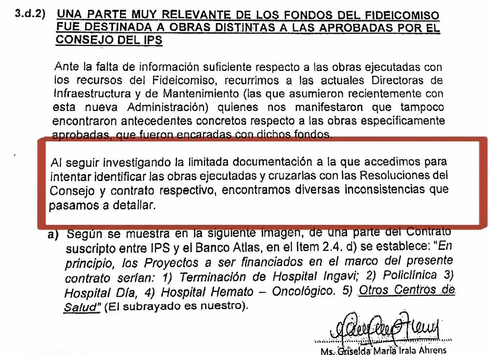 Lo cierto es que según el informe de auditoría del IPS, las obras que se debieron realizar no están, la plata tampoco. Es decir, calzaron el presupuesto de salud del IPS con dichos montos, hasta salarios se han pagado con estos recursos y ahora el banco de los Zuccolillo retiene cada mes del IPS G. 160 mil millones para saldar la deuda generada. El fideicomiso era exclusivamente para estas obras: Terminación Hospital Ingavi, Construcción Policlínica, Construcción Hospital Día y Construcción Hospital Hemato-Oncológico. De las 4 obras que figuran en el contrato, los primeros 3 no están