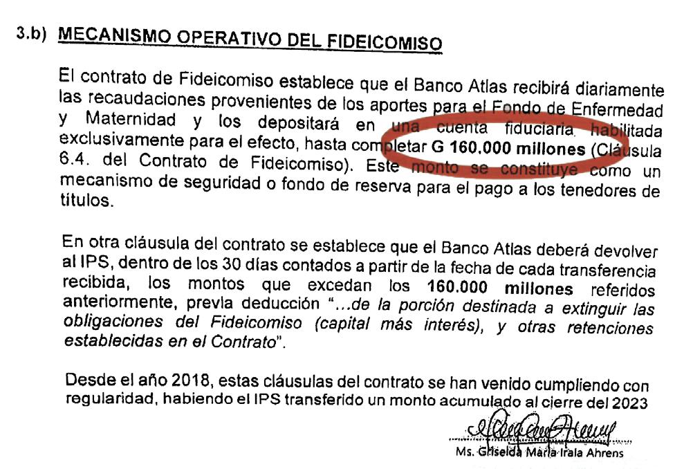 cieras con las que el IPS podría operar. Finalmente, el Consejo de Administración decidió autorizar la Operación del Fideicomiso de Titularización, Administración y Pago “IPSFondo de Enfermedad y Maternidad” al banco Atlas SA. En virtud del contrato el IPS se comprometió a depositar en el banco de los Zuccolillo el total de las recaudaciones diarias de los aportantes en el porcentaje que corresponde a los fondos de salud. El banco Atlas emitió títulos que fueron adquiridos a la vez por el Fondo de Jubilaciones del IPS por valor de G. 828 mil millones.