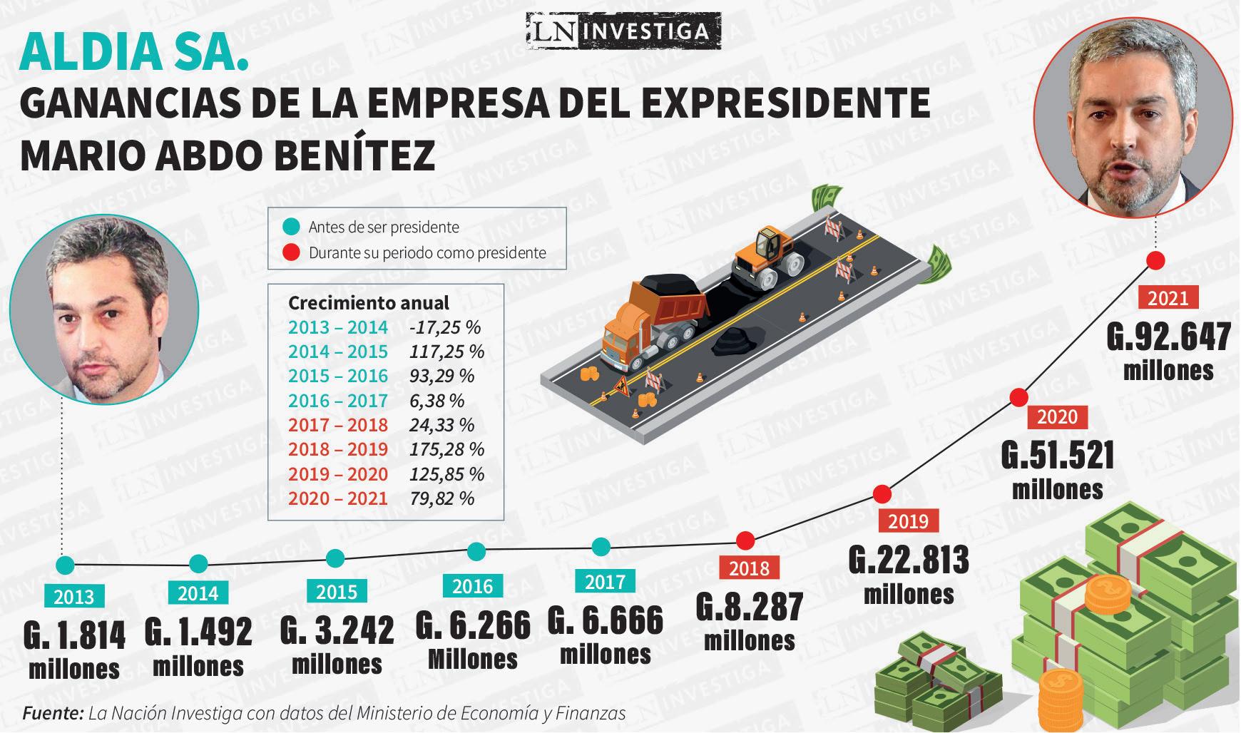 Al dejar el cargo de presidente de la República, Abdo Benítez solo declaró el cobro mensual de G. 338 millones en concepto de dividendos, que en el año suma G. 4.067 millones. Esto generó en su momento dudas, debido a que las actas asamblearias de Aldia SA revelaban las millonarias utilidades, ahora ratificadas por la CGR.