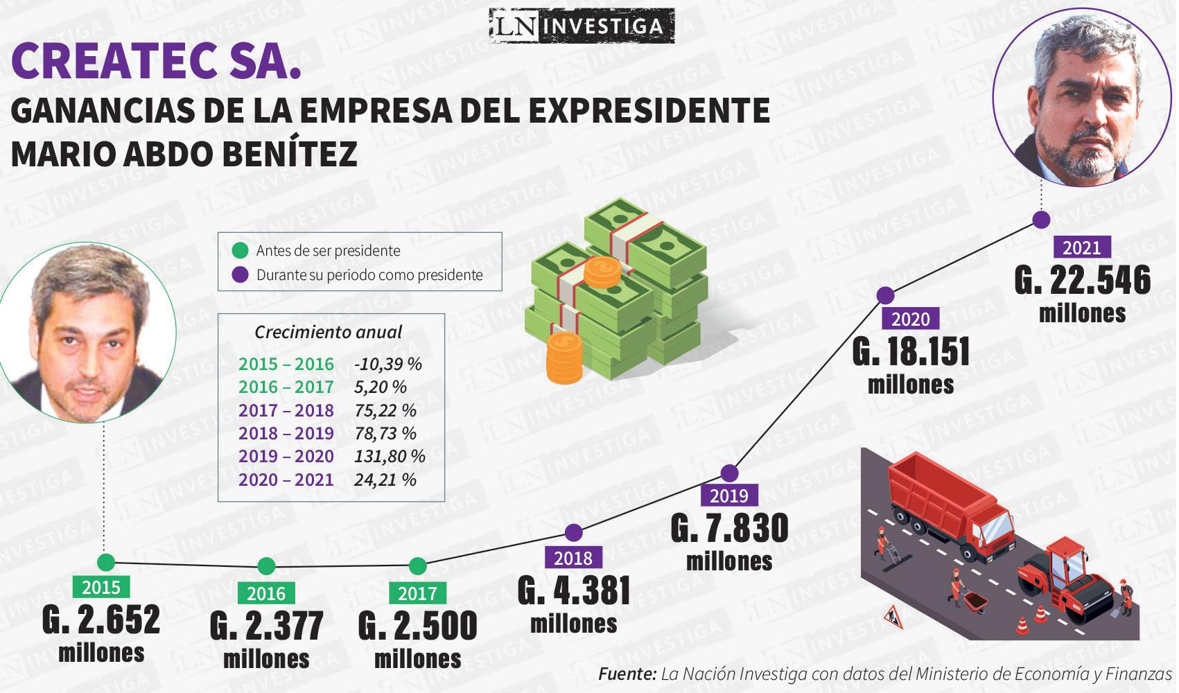Uno de los puntos que salta a la vista de forma casi inmediata al leer el informe de casi 300 páginas que suma junto con los anexos es que las firmas ligadas a Abdo experimentaron un millonario crecimiento en sus ganancias entre los años 2018 y 2023, precisamente el período en el que su accionista mayoritario se desempeñaba como presidente de la República.