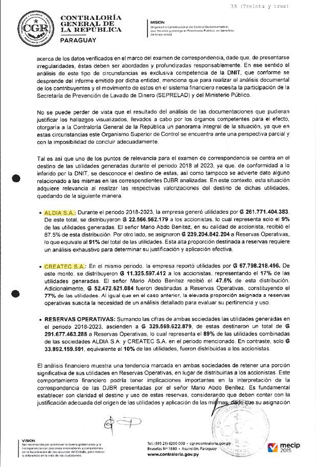 del mandato de Abdo (20182023), su empresa Aldia SA generó utilidades por más de G. 261.771 millones. Llamativamente, más de G. 239.000 millones, correspondientes al 91% de esas utilidades, fueron enviados a supuestas reservas operativas.