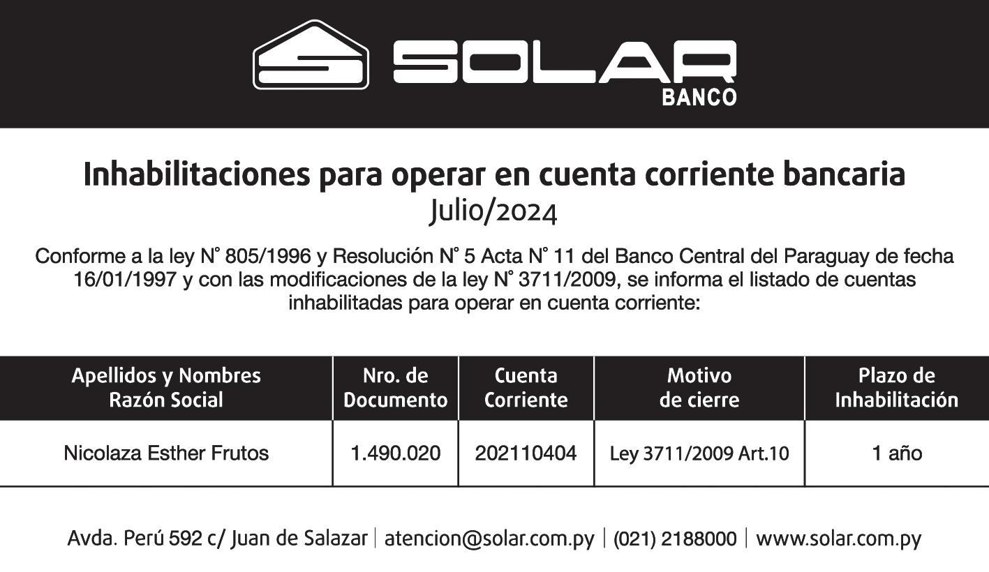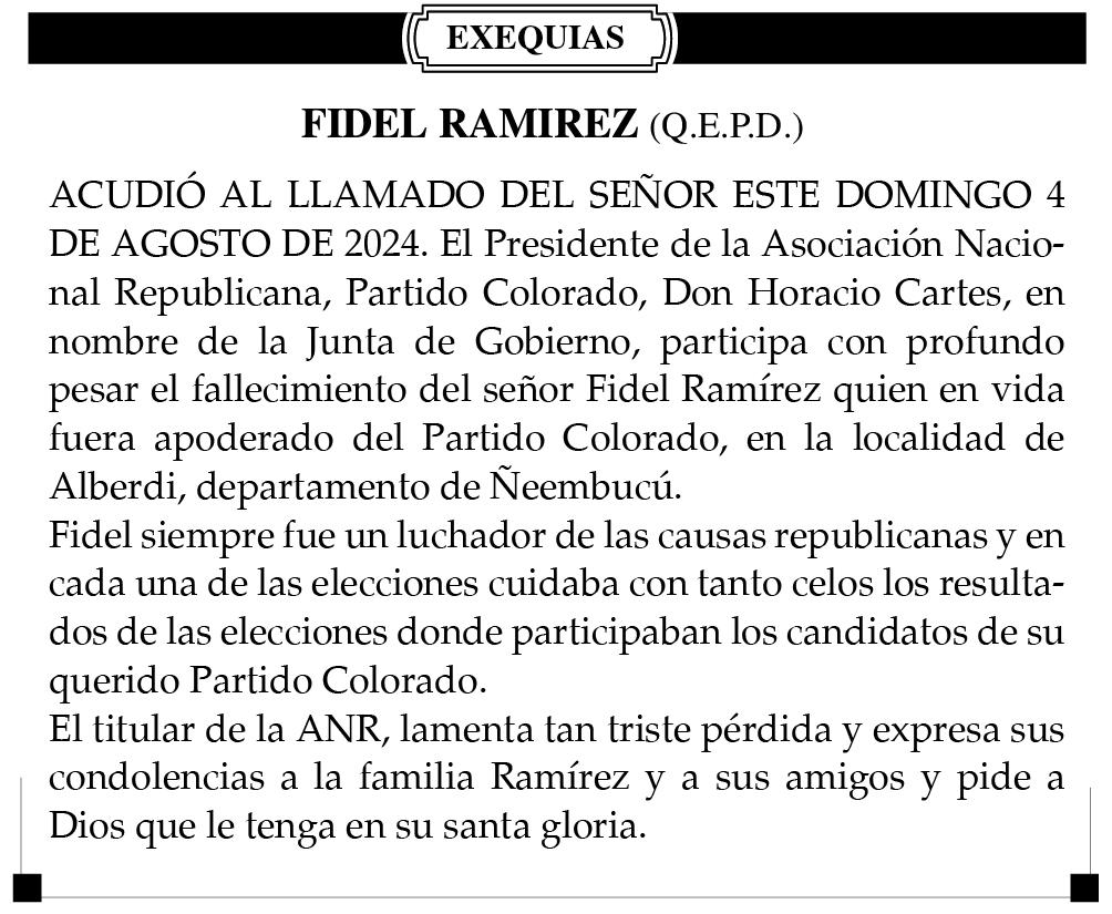 SUCESIÓN. LA JUEZ DE PRIMERA INSTANCIA EN LO CIVIL, COMERCIAL y LABORAL DE SAN PEDRO DEL PARANÁ, DE LA TERCERA CIRCUNSCRIPCIÓN JUDICIAL DE LA REPÚBLICA, Abg. FRANCISCA SOLANA AQUINO, cita y emplaza por sesenta días a herederos y acreedores de la sucesión de VIDAL RAMIREZ BENITEZ. El juicio radica en la secretaría a mi cargo Abg. ANÍBAL AMARILLA NAVARRO, Actuario Judicial. SAN PEDRO DEL PARANÁ, 26 de julio de 2024. Se hace saber al destinatario de este edicto que el mismo cuenta con el Código QR, por lo cual, para tener certeza de que este documento es válido, deberá utilizar el lector del Código QR, siendo ya en consecuencia innecesaria la autenticación manual del Actuario del Juzgado conforme Acordada 1366/2019. -73521/10/08.-