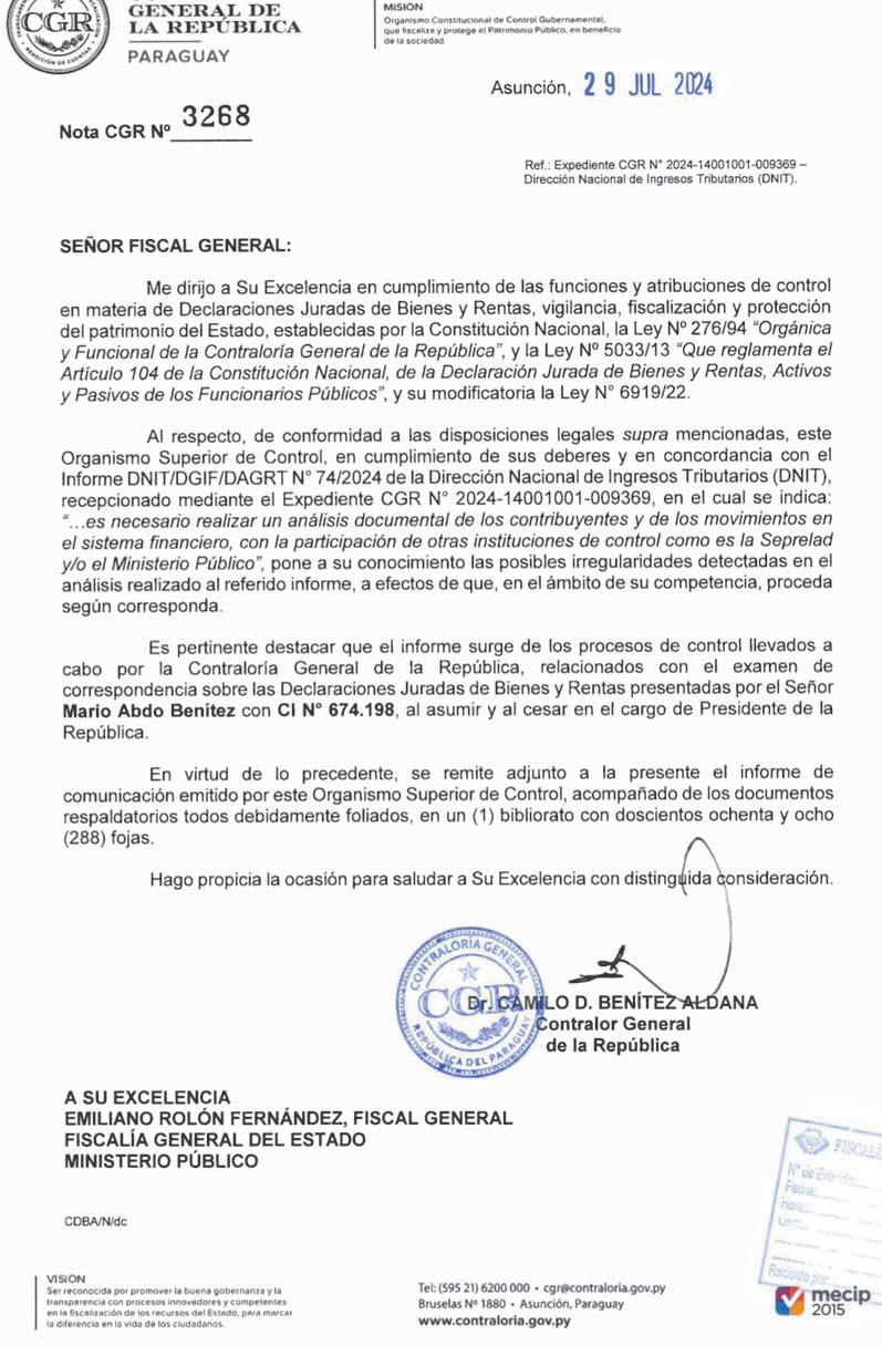 Benítez Aldana refirió en entrevista con Telefuturo que la Contraloría no puede determinar la existencia o no de los ilícitos, pero que sí cree que instituciones como la Dirección Nacional de Ingresos Tributarios (DNIT), Seprelad o el Ministerio Público deben tomar cartas en el asunto.