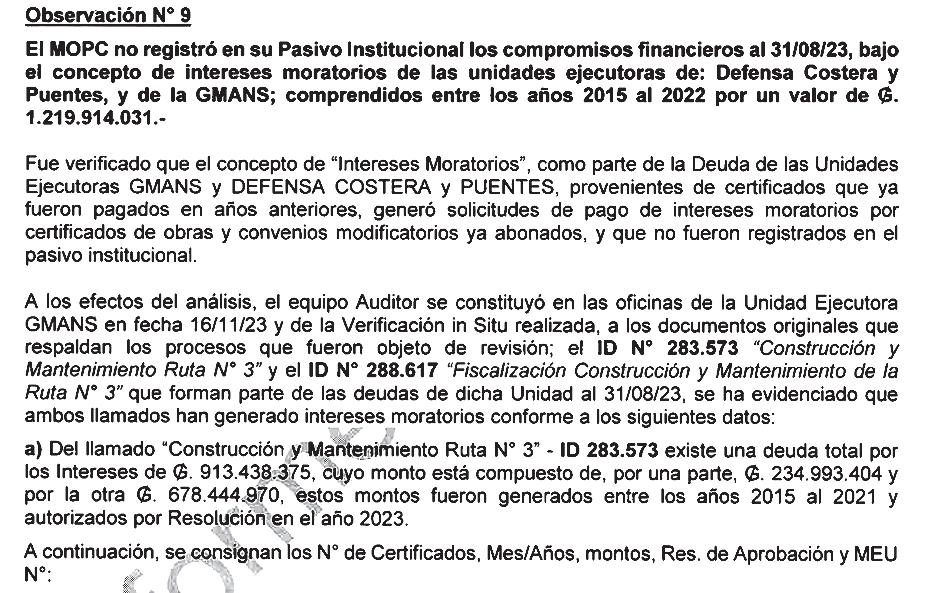 El resultado de este trabajo de fiscalización se plasmó en el Informe Preliminar de Comunicación de Observaciones, en el que se expone que hubo diferencias entre las cantidades certificadas y las realmente ejecutadas, por un monto de alrededor de G. 1.760 millones.