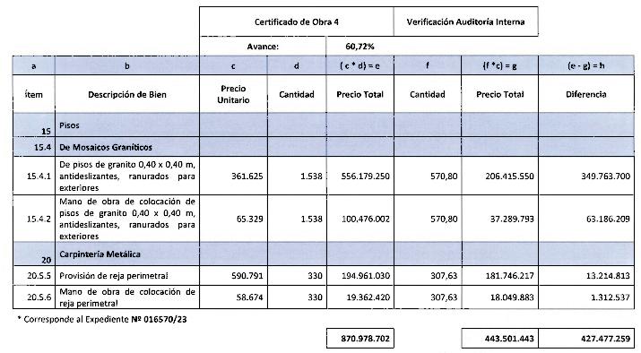 En tanto, en el hospital de Encarnación la misma empresa (MM SA Constructora) no cumplió con todos los requisitos del contrato, ya que se constataron diferencias por G. 50.850.422, específicamente en el área de pabellón polivalente-cirugía y traumatología.