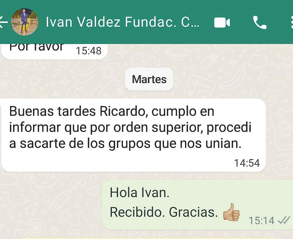 “Cumplo en informar que, por orden superior, procedí a sacarte de los grupos que nos unían”, fue la respuesta que recibió vía WhatsApp Ricardo Torres, auditor y fundador de la Asociación Civil de la ciudad de Mariano Roque Alonso (ACMRA), por parte de funcionario del CIRD en su momento. Esto luego de que el mismo objetara un gasto de “secretaría del proyecto” que fue incluido arbitrariamente en la iniciativa “Control Ciudadano”, en el marco de Más Ciudadanía, Menos Corrupción.