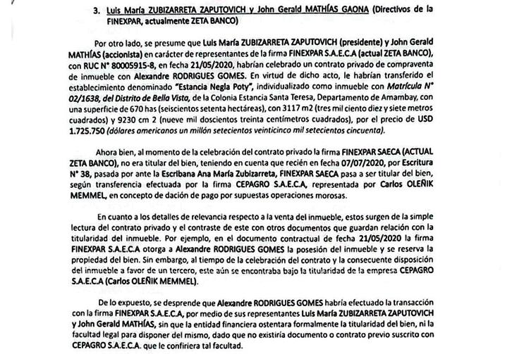 En el presente caso, están imputados: Mario Abdo Benítez, Carlos Arregui, Arnaldo Giuzzio, René Fernández, Carmen Pereira, Daniel Farías, Guillermo Preda, Francisco Pereira y Mauricio Espínola. Los supuestos delitos cometidos que se les atribuyen son: revelación de secretos de servicio, revelación de secretos privados por funcionarios o personas con obligación especial, inducción a un subordinado a un hecho punible, denuncia falsa, simulación de un hecho punible, usurpación de funciones públicas y asociación criminal.