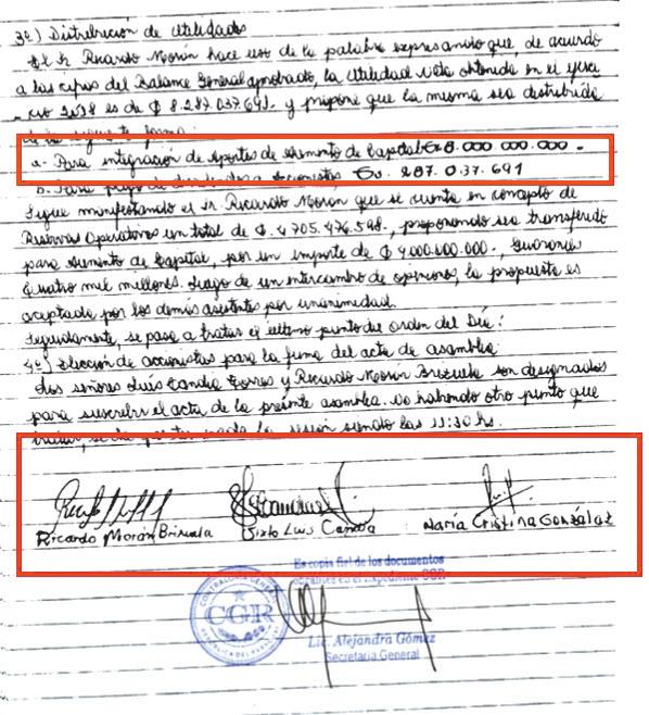 Según la Contraloría, no existe prueba documental que indique a dónde fue destinado el dinero, ya que las actas de las asambleas no mencionan ese aspecto, lo que eleva las sospechas de evasión y lavado de activos. P. 3