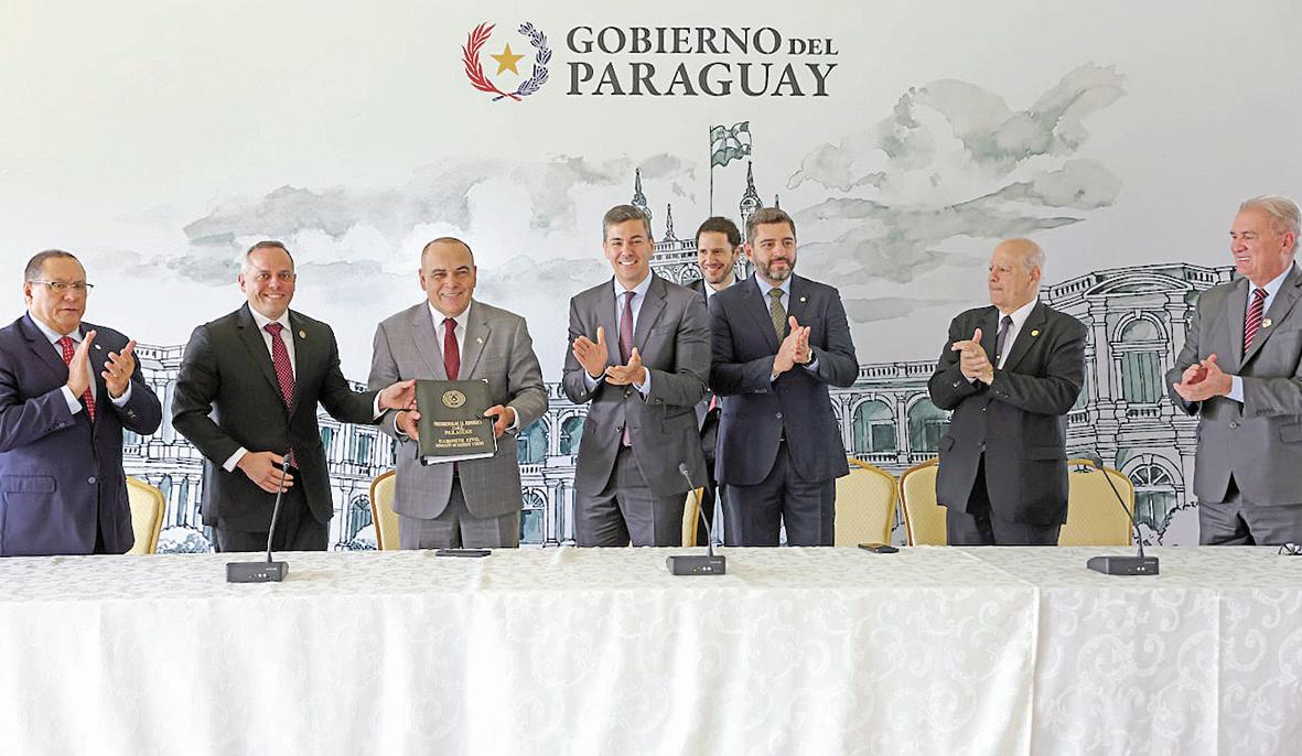 El presidente de la República, Santiago Peña, junto a los presidentes de los poderes Legislativo y Judicial, presentaron el nuevo proyecto de ley en el marco de la lucha contra la corrupción