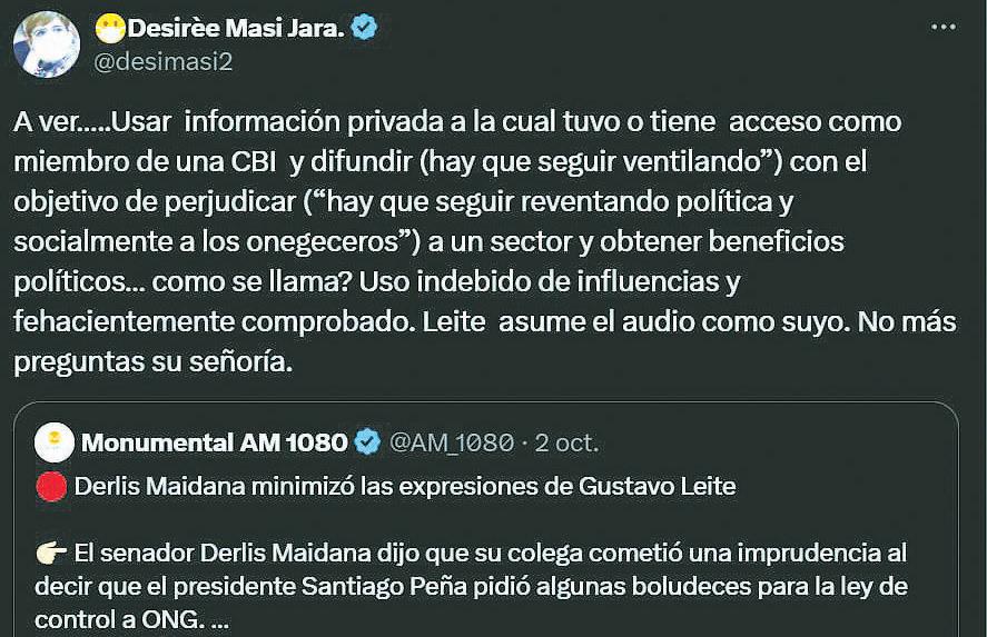 recieron políticos de la oposición como la exsenadora Desirée Masi, que terminaron de ventilar el verdadero fin del circuito político-comunicacional: pedir la cabeza de Leite.