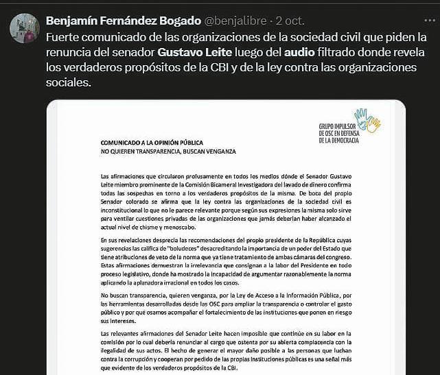 Fue entonces que medios “independientes”, internautas y políticos iniciaron un operativo pantalla y contraataque. El elegido como el blanco fue el senador Gustavo Leite, quien lleva meses siendo molestia debido a su postura crítica con respecto al dinero que reciben las supuestas organizaciones sin fines de lucro.
