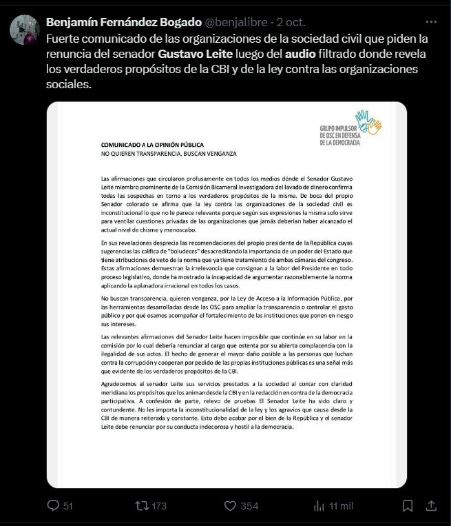 Los ataques al senador Gustavo Leite por parte de medios y defensores de organizaciones no gubernamentales muestran la hipocresía del esquema político-comunicacional que busca distraer la atención del negociado de las ONG.