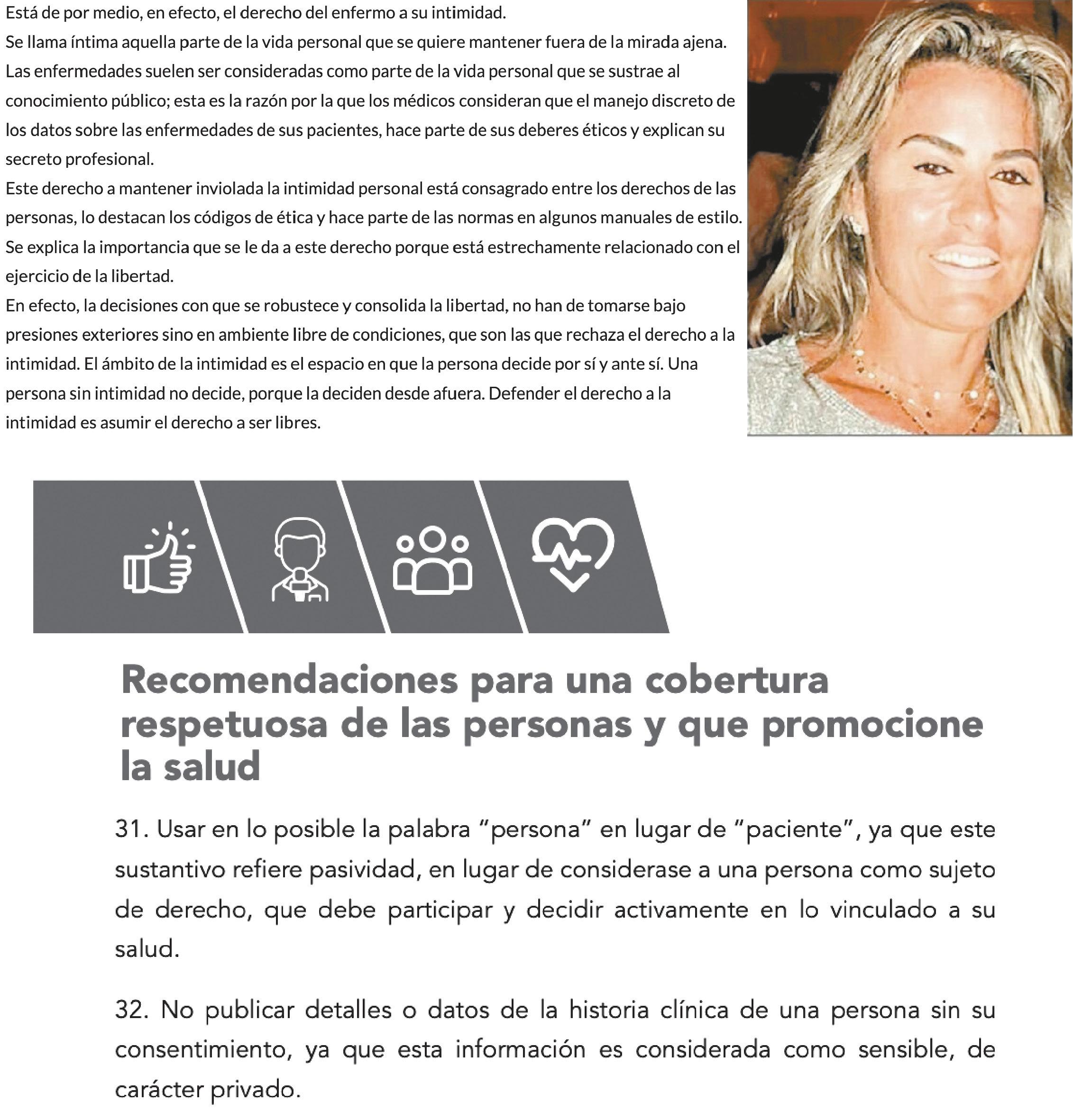 El manual de ética elaborado por el Instituto Idea establece una serie de “recomendaciones para cobertura respetuosa de las personas”. En el material establece: “No publicar detalles o datos de la historia clínica de una persona sin su consentimiento, ya que esta información es considerada como sensible, de carácter privado”.