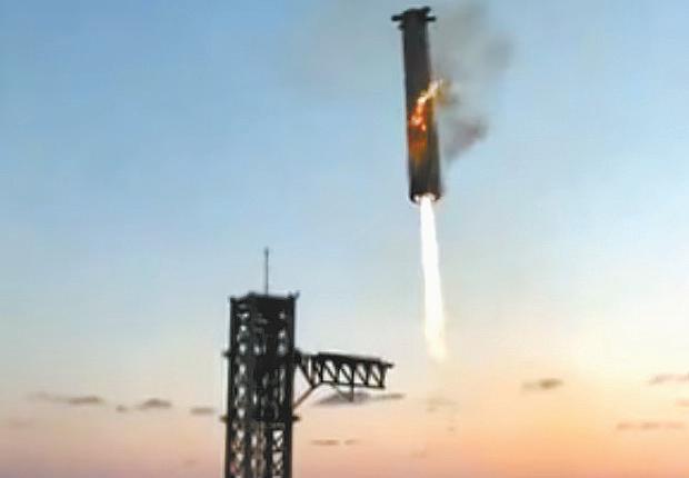 tocara el suelo cuando regresaba a su plataforma de lanzamiento, unos brazos mecánicos instalados en la torre, apodados “los palillos”, se cerraron sobre el aparato y lo inmovilizaron, según un video difundido por la empresa del multimillonario Elon Musk.Poco después, la parte superior de Starship amerizó en el océano Índico, tal y como estaba previsto.